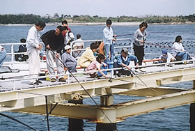 大島から沖に突き出した、ちょっと珍しいタイプの釣りセンター。底に漁礁があるので魚が集まってくる。船釣りなみの大物がねらえるぞ!!