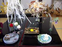 第2回は、用意された陶器の器に、自分で加工したプリザーブドフラワーをアレンジ。アレンジメントの基本を覚えました。第3回は、各自アイデアを駆使して個性あふれるオリジナルのアレンジに挑戦するという応用編。色合いにも組み合わせにもそれぞれの工夫が見られ、ステキな作品に仕上がりました。「花咲く島の花々展」は、このワークショップで作った作品の発表会です。