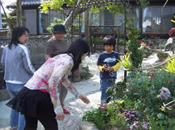 佐久島を歩くと、野の花の多さもさることながら、花がいっぱい植えられていることに気づきます。もともとお墓や弘法さんにお供えする花が育てられていたようですが、いつしか花の種類も増えて、今ではおしゃれな花もいろいろ。今回のワークショップに参加したのは、そんな素敵な花々を育てている花好きの女性たち。女子高校生や子どもも参加してくれました。講師は名古屋で活躍するフローリストの酒井美圭さん。ワークショップは「プリザーブドフラワー」の説明からはじまりました。