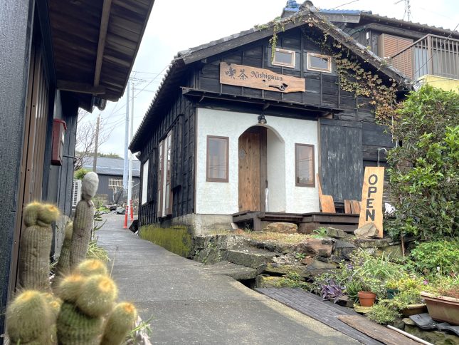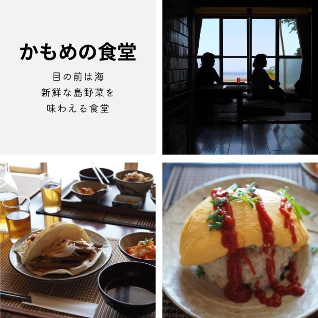 海の見える古民家カフェ。田舎のおばあちゃんちに来たようなくつろぎ感たっぷり。自家焙煎のコーヒーを、自家製のパンやケーキとともにどうぞ。西尾の抹茶や島の果実など、素材にこだわったドリンク類も楽しめます。