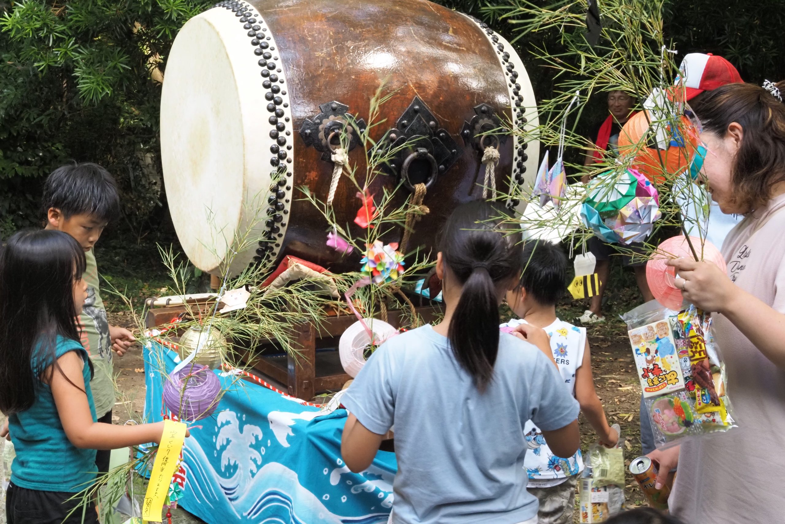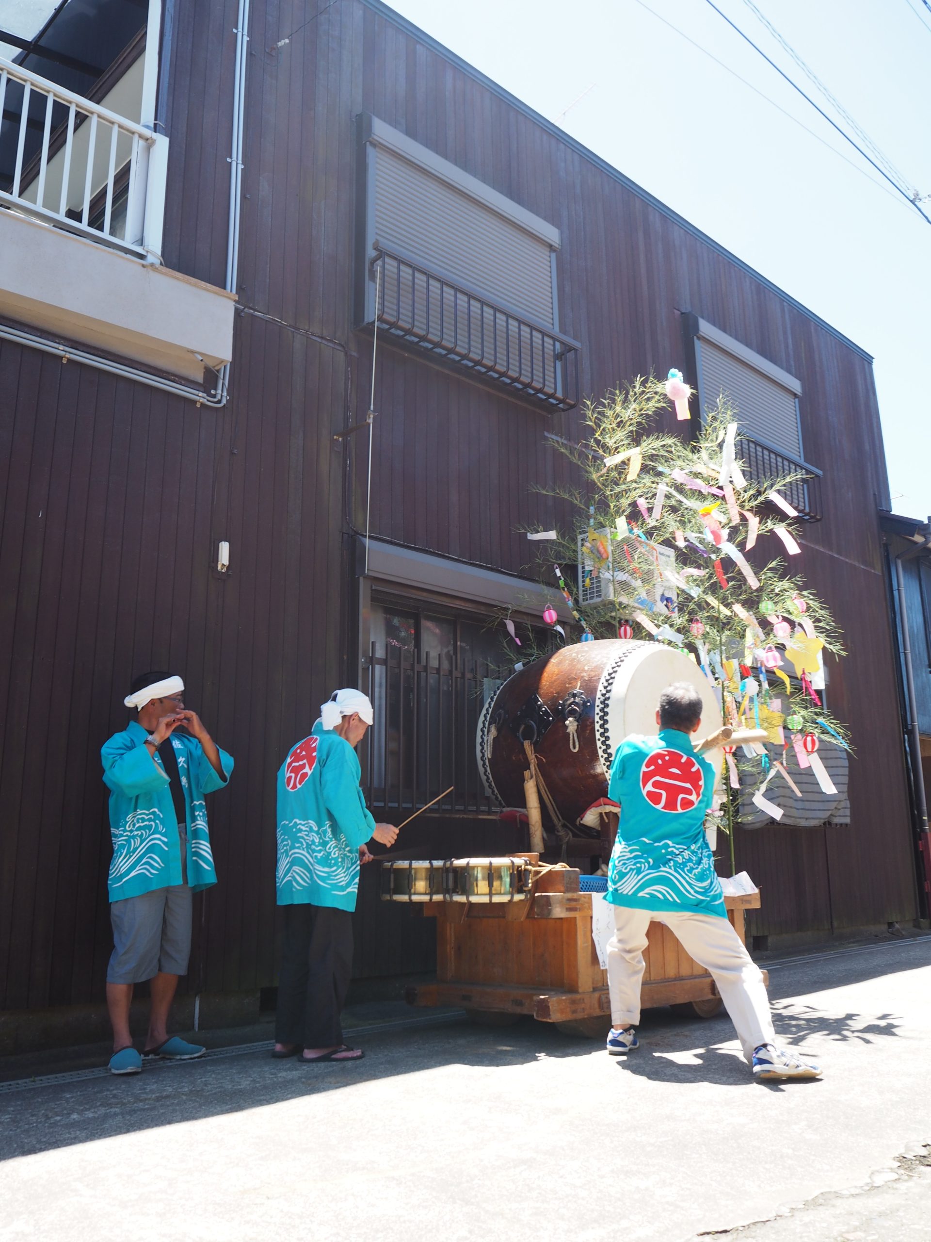 七夕飾りで彩られた台車は、太鼓の音とともに西の集落(つるやさんの前、もんぺまるけの前)を練り歩きながら、目的地である津島神社を目指します。
