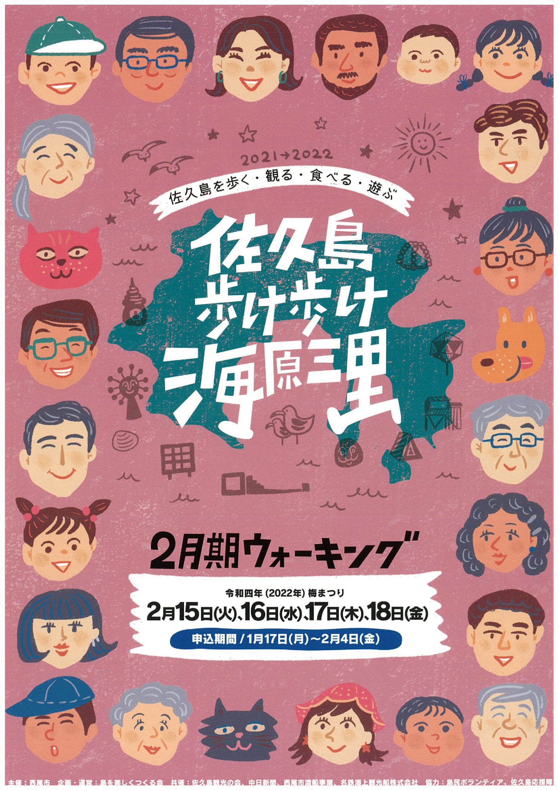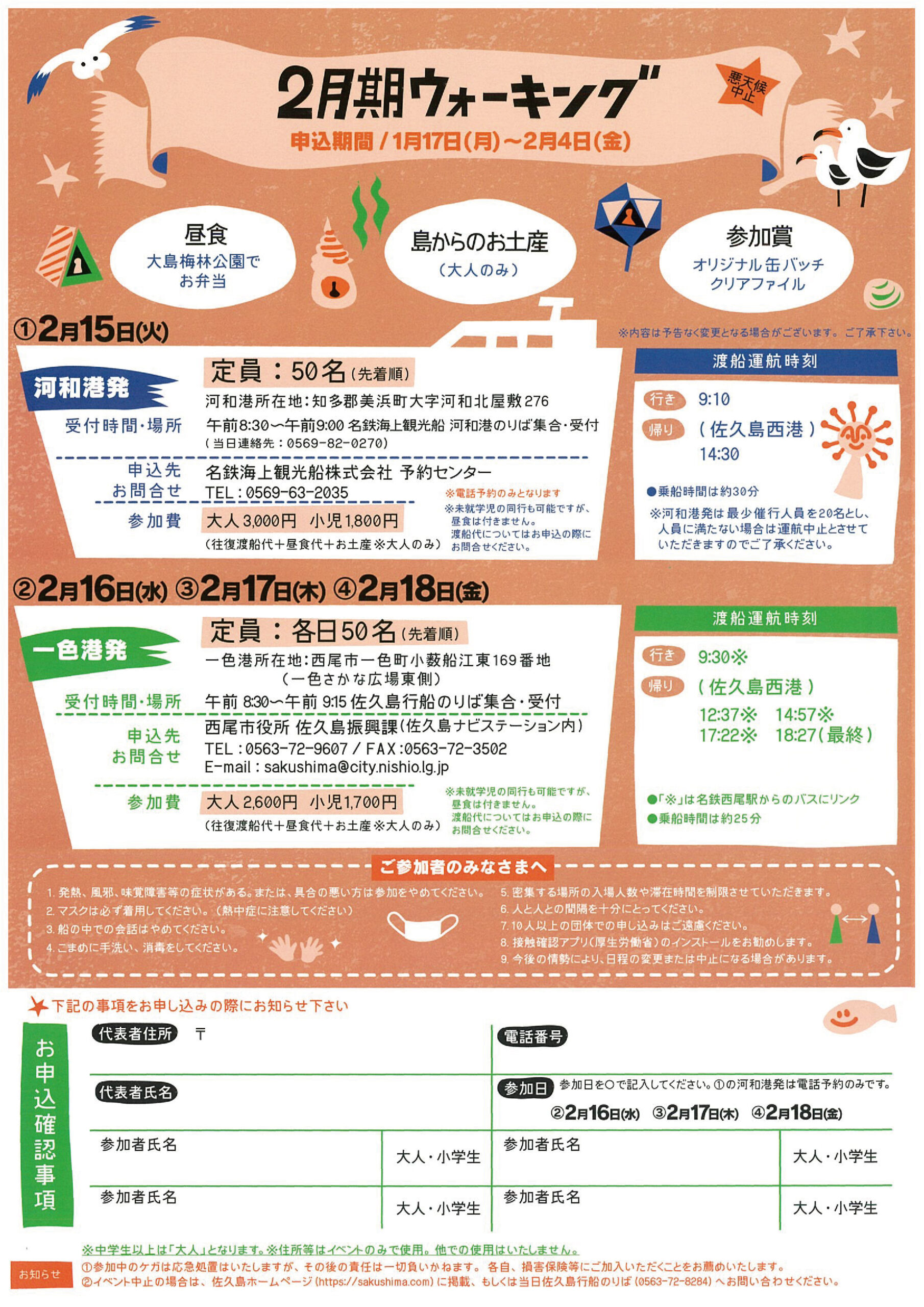 新型コロナウイルスの感染拡大防止のため、令和4年2月 15日(火)・16日(水)・17日(木)・18日(金)の全4回 開催予定であった『佐久島歩け歩け海原三里』は中止とさせていただきます。