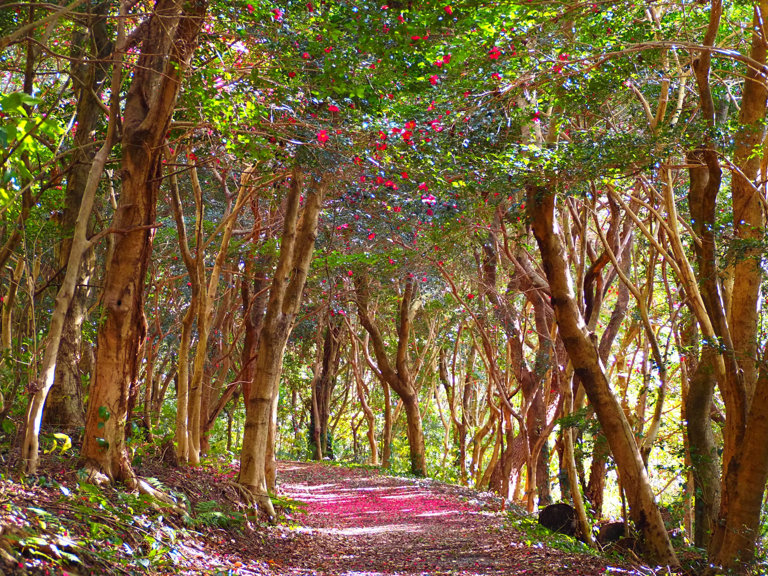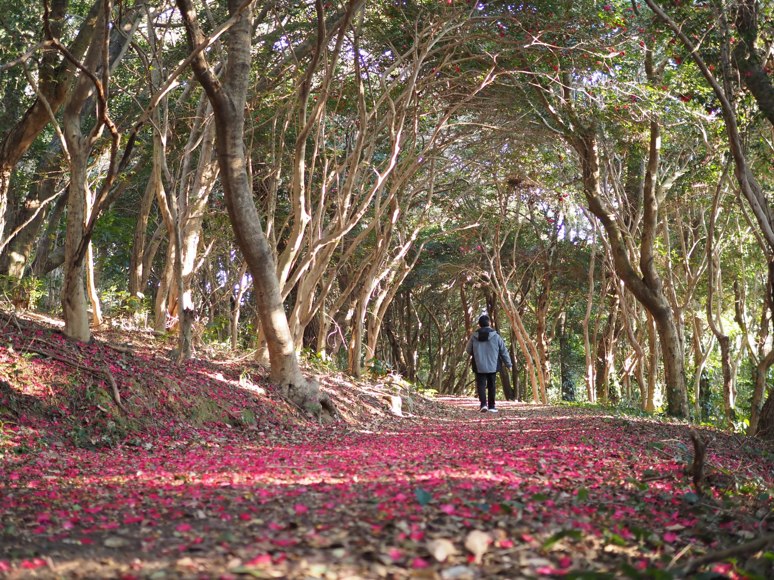 大山のサザンカの径、だいぶピンクに染まってきました。