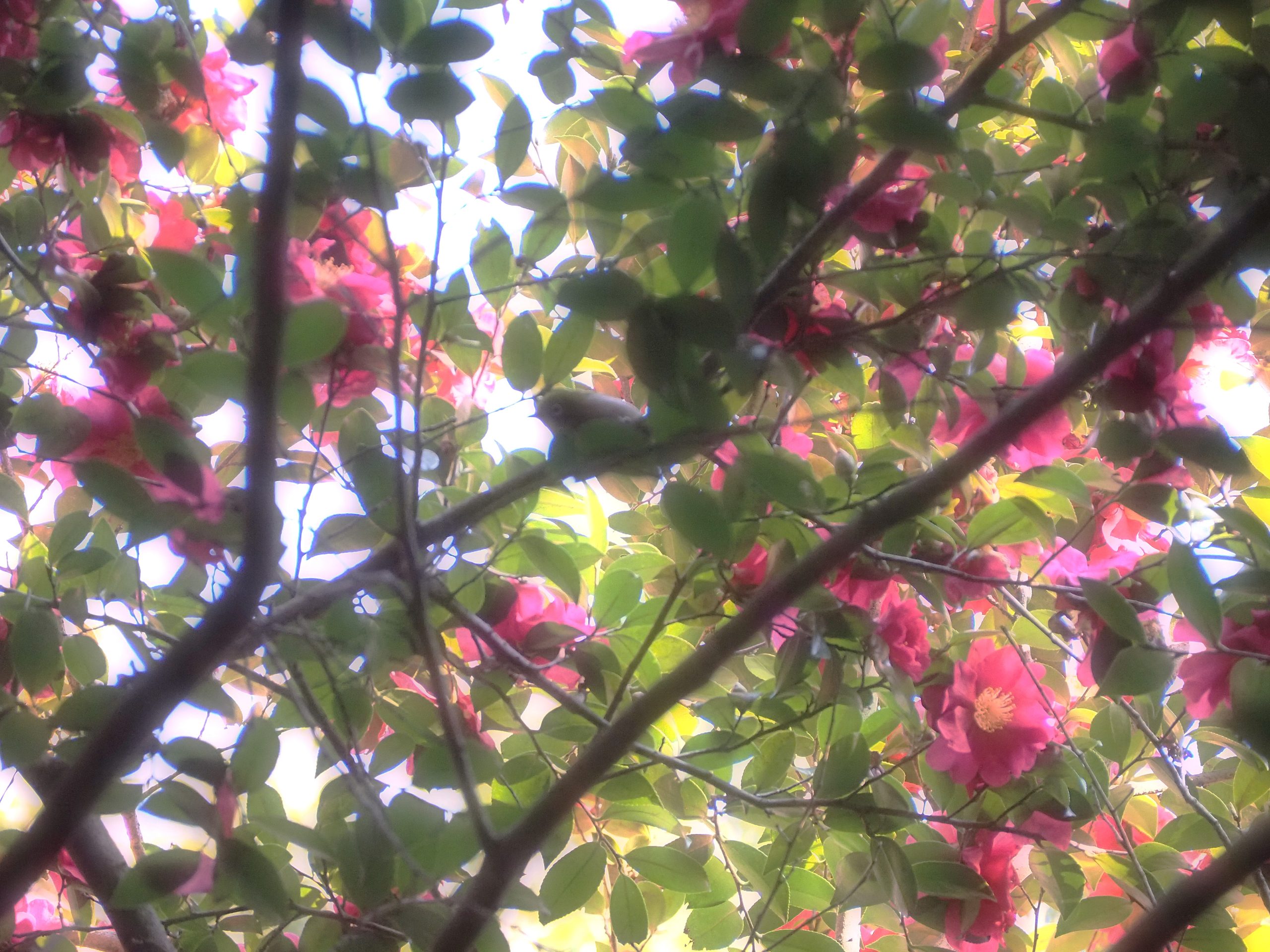 鳥の声が聞こえてきて、見上げてみるとサザンカの花の蜜を吸うメジロたち。