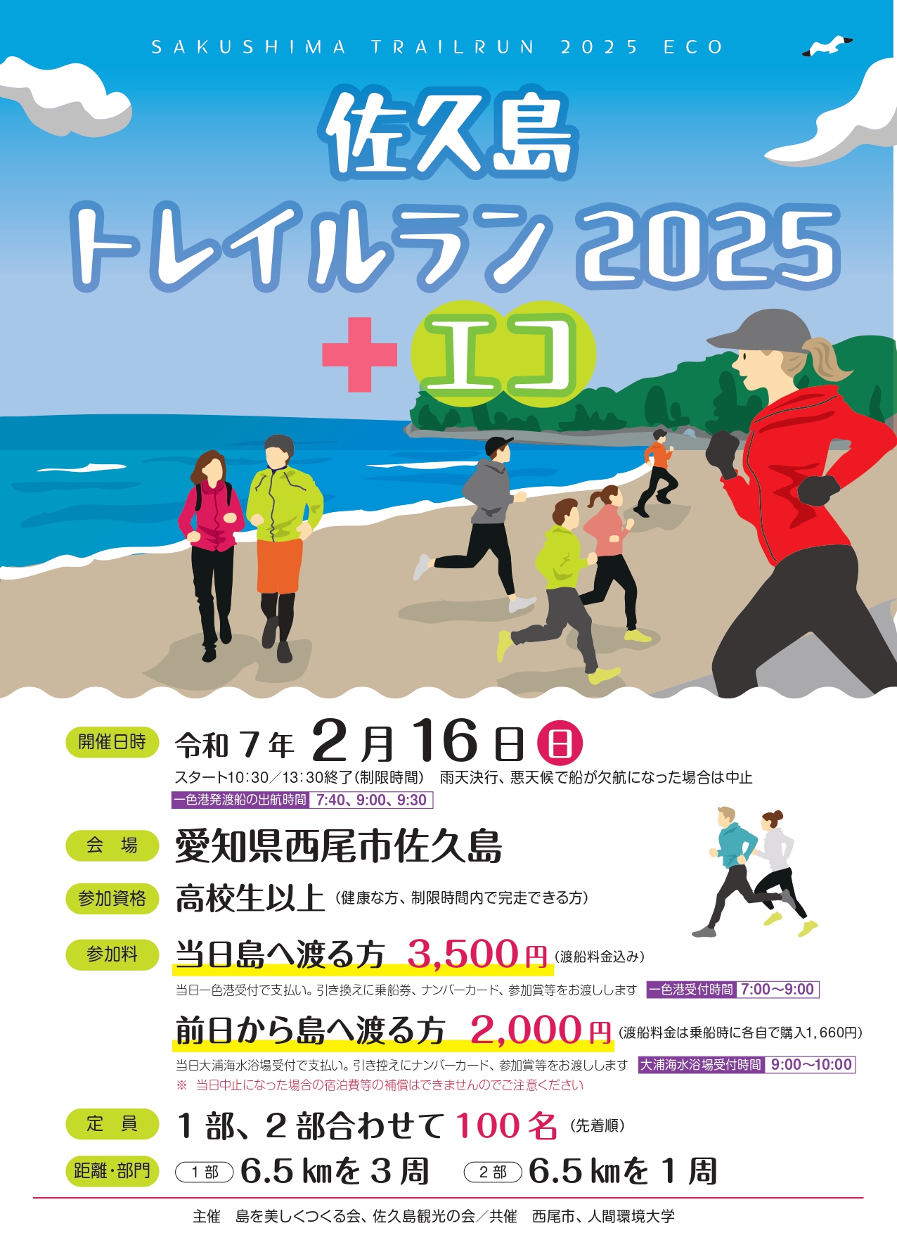 佐久島で初開催のトレイルランニング。山あり海あり、梅、椿満開、アート作品と見どころも満載のコースです。また、+エコでは島ならではの問題を解決できるよう企画しました。