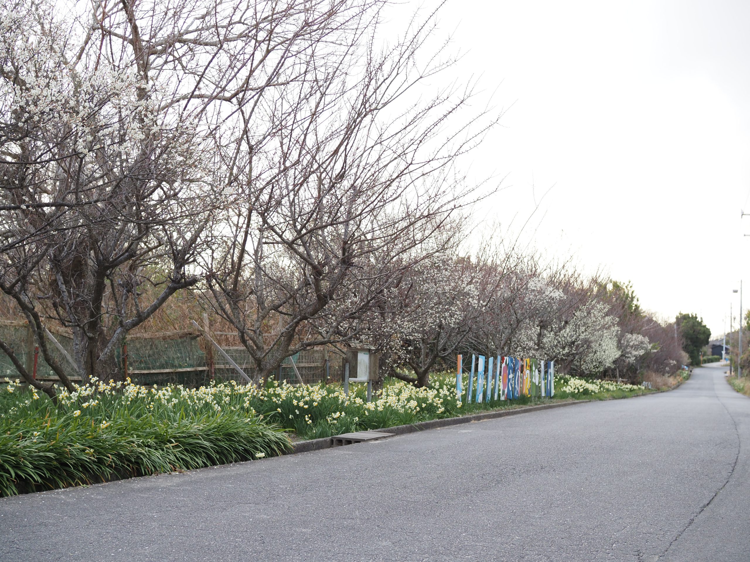 海風を感じながら歩けるメインロードでは、一面に広がる水仙が訪れる人を迎え、白と黄色の花が足元をやさしく彩ります。