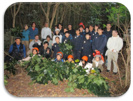 毎年しおさい学校でカクレミノという雑木を伐採します。カクレミノは成長が早く、冬でも葉が生い茂っているので他の広葉樹の成長を妨げます。海にたっぷりの栄養を運んでくれる山の整備を行っています。