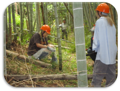 グループに分かれて竹の切り方(倒し方)を教わりながら安全に切り出します。午後からは竹炭作りと学生たちから提案された「竹あかり」を作りました。