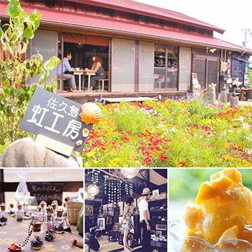 東渡船場すぐ前のカフェ。ドリンク類のほかカレーなどの食事もできます。かき氷やソフトクリームなどのテイクアウトも人気です。特にかき氷のメニューが豊富で、この店だけのオリジナルもいろいろ。