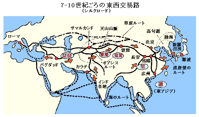 西遊記で有名な唐の玄弉三蔵(7世紀)が西域のシルクロードを経てインドに経典を求めに出掛けましたが、唐時代(7-10世紀)は西域経由のオアシス・シルクロードが最も栄えた時代と言えます。下の概略図よりは実際はもっと細かく交易路が発達していました。9世紀初め、唐の長安と西のイスラム世界の中心バグダッドはともに人口100万を越す世界最大の都市でした。